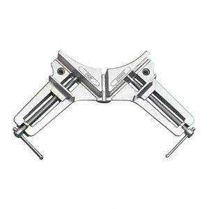 Fixed at 90ΓΈ, clamps miter or butt joints. Holds work up to 3" wide and leaves joints fully exposed for miter correction, doweling, gluing or nailing. Two countersunk holes permit the clamp to be benchtop mounted (four clamps mounted as such provide a rectangular clamping fixture of unlimited size), die cast aluminum frame and sliding jaws, plated cold drawn steel screws with USS threads and steel sliding-pin handles.